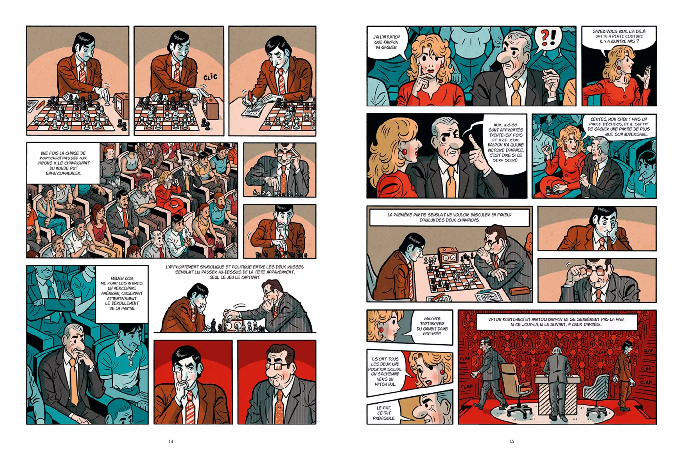 Ce qui rend cette BD particulièrement captivante, c’est la façon dont le récit combine l’intensité du jeu d’échecs avec un contexte de tensions politiques et d’espionnage. Au fil de l’histoire, se déploie une intrigue de meurtres en série, dont un innocent devient la victime, révélant un aspect sombre et sordide derrière la compétition. La narration est pleine de rebondissements, ce qui maintient le lecteur en haleine jusqu’à la fin, qui s’avère à la fois marquante et inattendue.